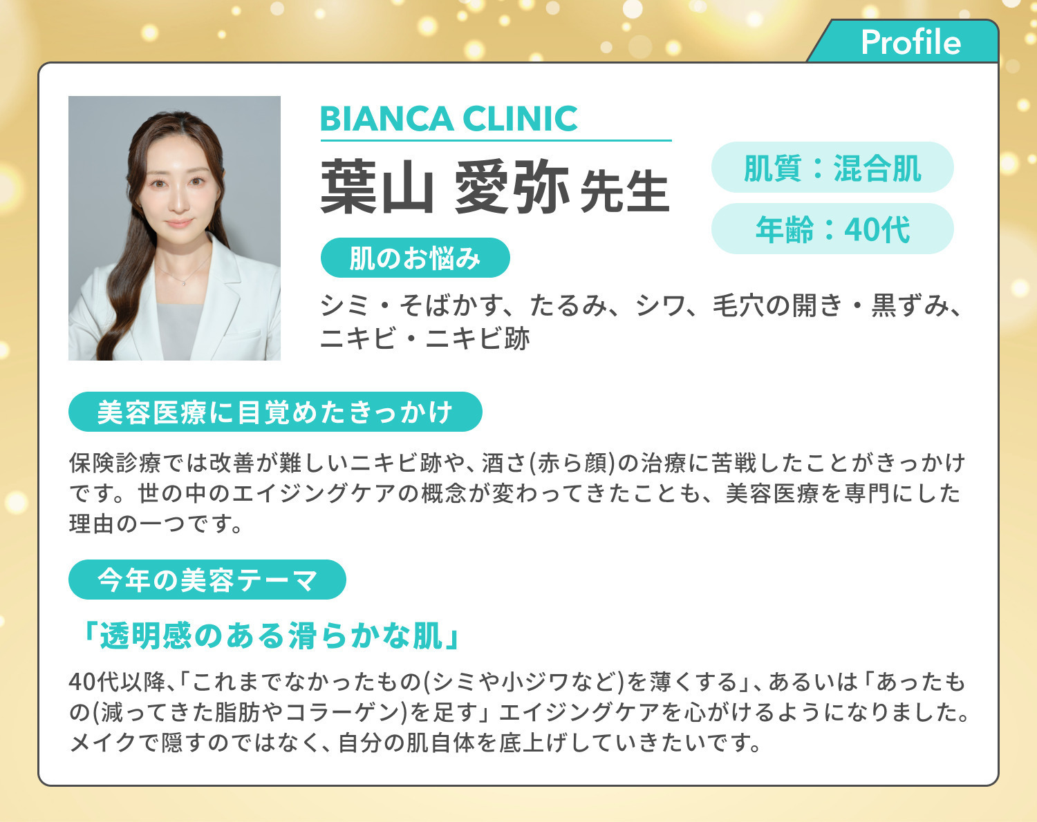 日本大学医学部卒業後、東京女子医科大学病院皮膚科や聖母病院などを経て、吉祥寺まなみ皮フ科を立ち上げ。2025年よりBIANCA CLINIC勤務。日本皮膚科学会認定 皮膚科専門医。