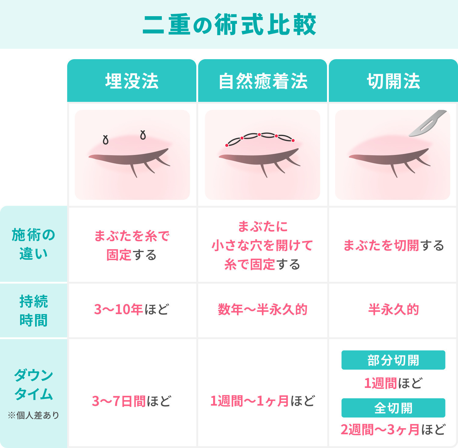 二重施術は、大きく 埋没法/自然癒着法/切開法 の3つに分けられます。