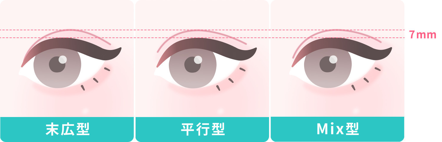 - 目頭側の形:末広型、MIX型、平行型