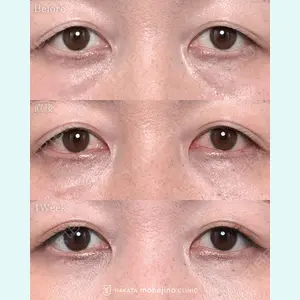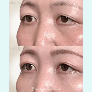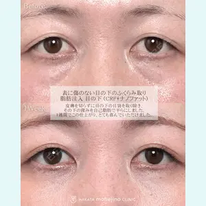 - 皮膚を切らずに目の下の目袋を取り除き、その下の窪みを自己脂肪で平らにしました。 1週間でこの仕上がり、とても喜んでいただけました。