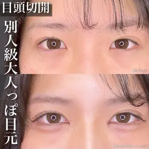 - 元々、左の目頭の方が蒙古襞の張りが強め。 目の幅が26mm、目と目の間隔は37mmで 日本人の平均の30mm〜34mm間隔よりもやや離れ気味。 蒙古襞が下に張っている事や、 離れ目を解消したいとの事だったので 黄金比を考慮しつつ、少し離れている目と目の間隔を調整しながら目頭切開をしました! 術後1か月で、かなり印象が大人っぽくなりました✨ 全く見えなかった涙丘もしっかり見えますね! 傷の治りも早い方で、メイクをすれば分からない程です。