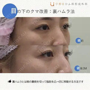 - この方は特に笑った時の膨らみが気になるとのことで、若くて皮膚のたるみがない、目袋の下の凹みがある、という事で裏ハムラを提案させていただきました。 術後は凸がへこんで、凹が膨らんでいるのがわかると思います。笑顔でもクマは出なくなりました。 この方に似てる感じで凹みがない場合は脱脂だけでも良いかと思います。 またその他の選択肢として脱脂と脂肪注入があります。 クマ取りは色々方法があり、それぞれメリットデメリットあります。自分がどれがいいかわからない人はご相談下さい。 ※モニターでの料金もあります。ご相談下さい。
