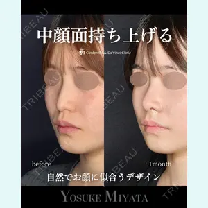- お鼻に高さが欲しいと希望のモニター様の症例です。 鼻筋から鼻先にかけてボリュームを出しつつ、猫手術と貴族手術を組み合わせて中顔面も同時に持ち上げ、より立体感のあるお鼻に仕上げています。 ただし、不自然にならないよう、お顔全体のバランスに調和する自然なお鼻を目指しました。