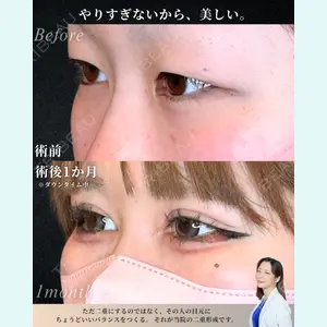 - ダウンタイム / リスク ・腫れ:手術直後〜数日。約1週間で落ち着き、1ヶ月ほどでラインが安定 ・内出血:稀に発生。まぶたが赤紫になる場合があるが、多くはメイクで隠せる程度 ・左右差:元の骨格・目の形によって起こる可能性あり ・角膜損傷:極めて稀だが報告例あり ・その他:違和感・異物反応・重瞼線の消失・感染・アレルギー反応など
