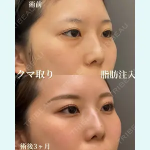 - 目の下のたるみ/くま取り(経結膜脱脂術) と脂肪注入 30代女性 術後3ヶ月です。 術後3ヶ月なので、脂肪の定着もほぼ完全に落ち着いた状態と考えられます。 クマの原因となっている眼窩脂肪が改善され、滑らかで明るい目元になっています。 脂肪注入は頰部のやつれ、目の下の凹み、青クマ、小ジワの改善に有効です。